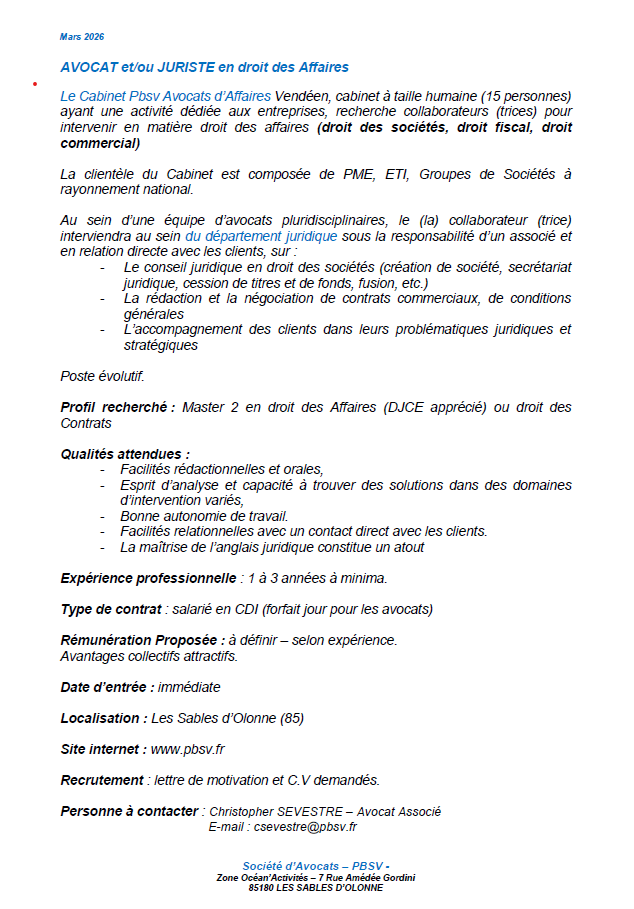 OFFRE DE COLLABORATION AVOCAT ET/OU JURISTE – DROIT DES AFFAIRES – LES SABLES D’OLONNE