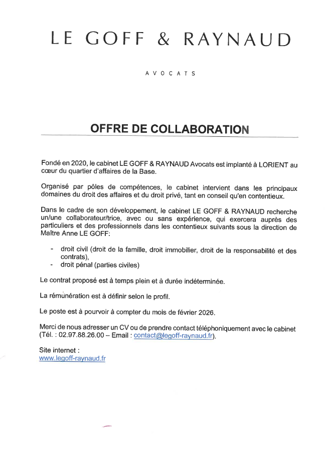 OFFRE DE COLLABORATION – DROIT CIVIL ET DROIT PENAL – LORIENT
