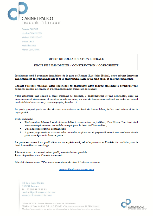 OFFRE DE COLLABORATION LIBERALE – DROIT IMMOBILIER, CONSTRUCTION ET COPROPRIETE – RENNES