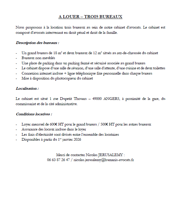 OFFRE DE LOCATION BUREAUX – ANGERS